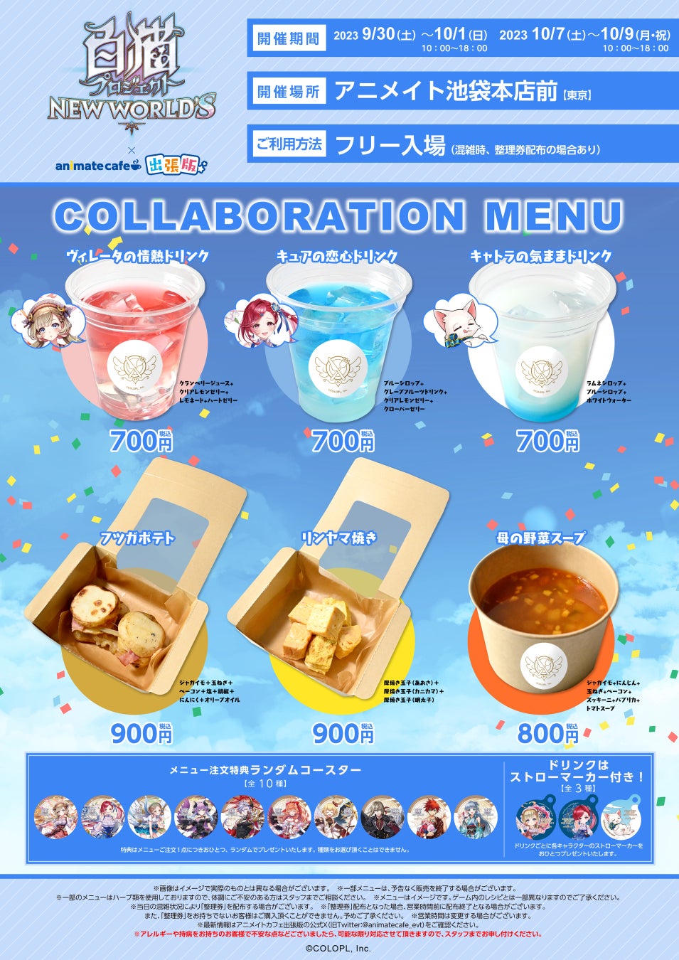 さらに、本イベントの開催を記念して、9月30日(土)より『アニメイトカフェ出張版』とのコラボレーションが決定しました。アニメイト池袋本店前にキッチンカーが登場し、コラボレーションメニューの販売を行います。当メニューをご注文いただいたお客様にはオリジナルコースターをプレゼントいたします。ゲームから現実の世界に飛び出した『白猫』料理をご堪能ください!