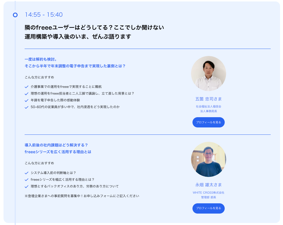 15:00-15:40 「隣のfreeeユーザーはどうしてる?ここでしか聞けない運用構築や導入後のいま、ぜんぶ語ります」/社会福祉法人福信会 法人事務局長 五箇忠司 氏・WHITE CROSS株式会社 管理部 部長 永畑雄太 氏