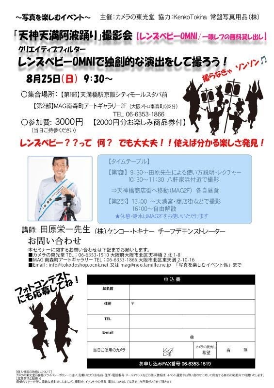株式会社ケンコー・トキナー(本社:東京都中野区、代表取締役社長:山中 徹)は、写真用品の知識の普及を目指し、各地カメラ店へ講師の派遣を行っています。8月25日(日)に大阪市・南森町「カメラの東光堂」主催にて、「「天満天神阿波踊り」撮影会(レンズベビーOMNIで独創的な演出して撮ろう!)撮影会イベントを行います。参加費は3,000円、事前予約が必要です。