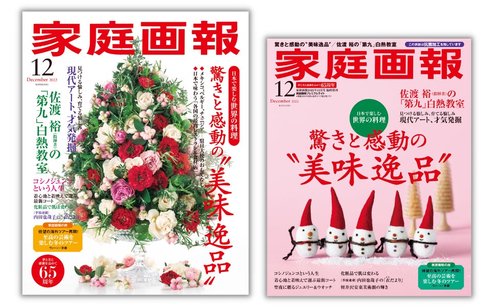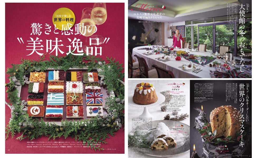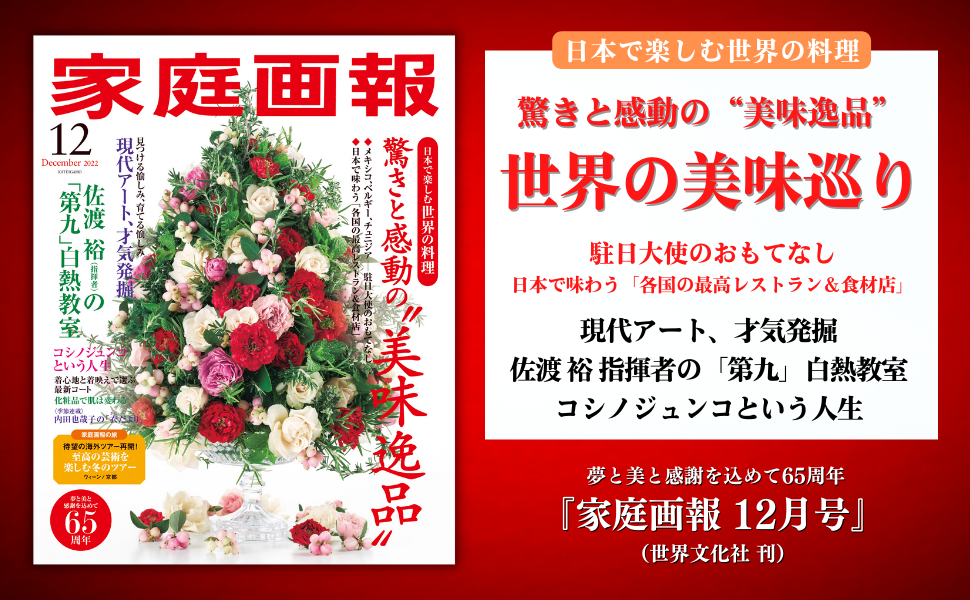 株式会社世界文化社は、『家庭画報 12月号』を11月1日(火)に発売しました。今号は、日本で楽しむ世界の料理「驚きと感動の“美味逸品”」と題し、駐日大使の冬のおもてなしや世界のクリスマスケーキ、日本で味わう各国の最高レストランを紹介。日本にいながら、世界の美味巡りを楽しめる内容になっています。