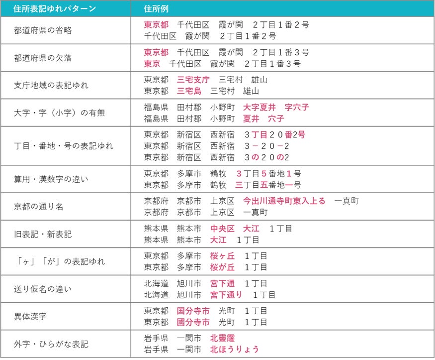 日本の住所構成は、単純な階層構造ではなく都道府県・市区町村・郡に加えて、支庁・政令指定都市や大字・字、さらに住居番号・地番・支号、建物名を含む方書が存在するなど、住所表記が多岐に渡ります。「住所クリーニングサービス」は、大字・字(小字)の有無や、送り仮名の違い、外字利用など、さまざまな表記ゆれに対応しています。