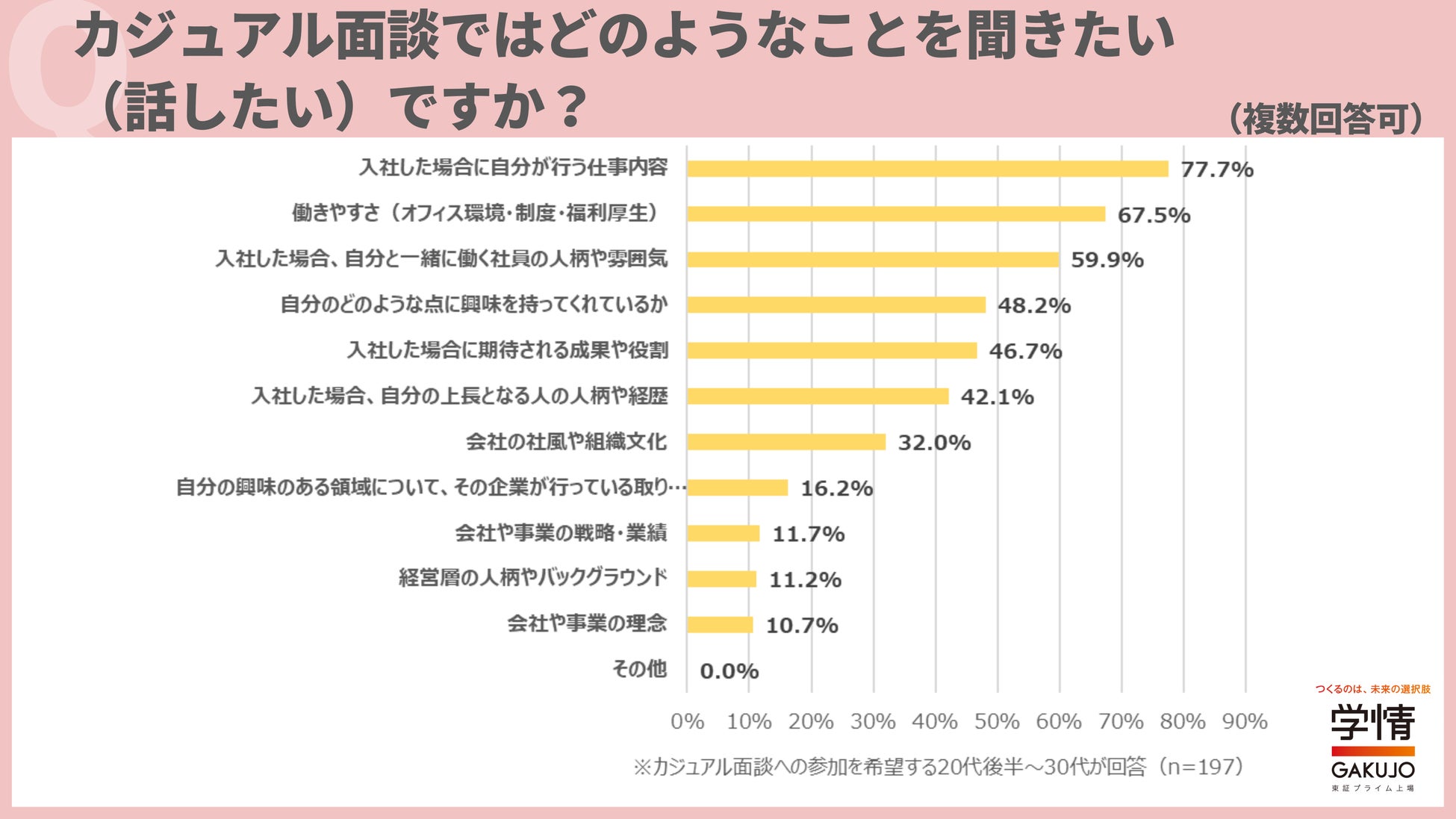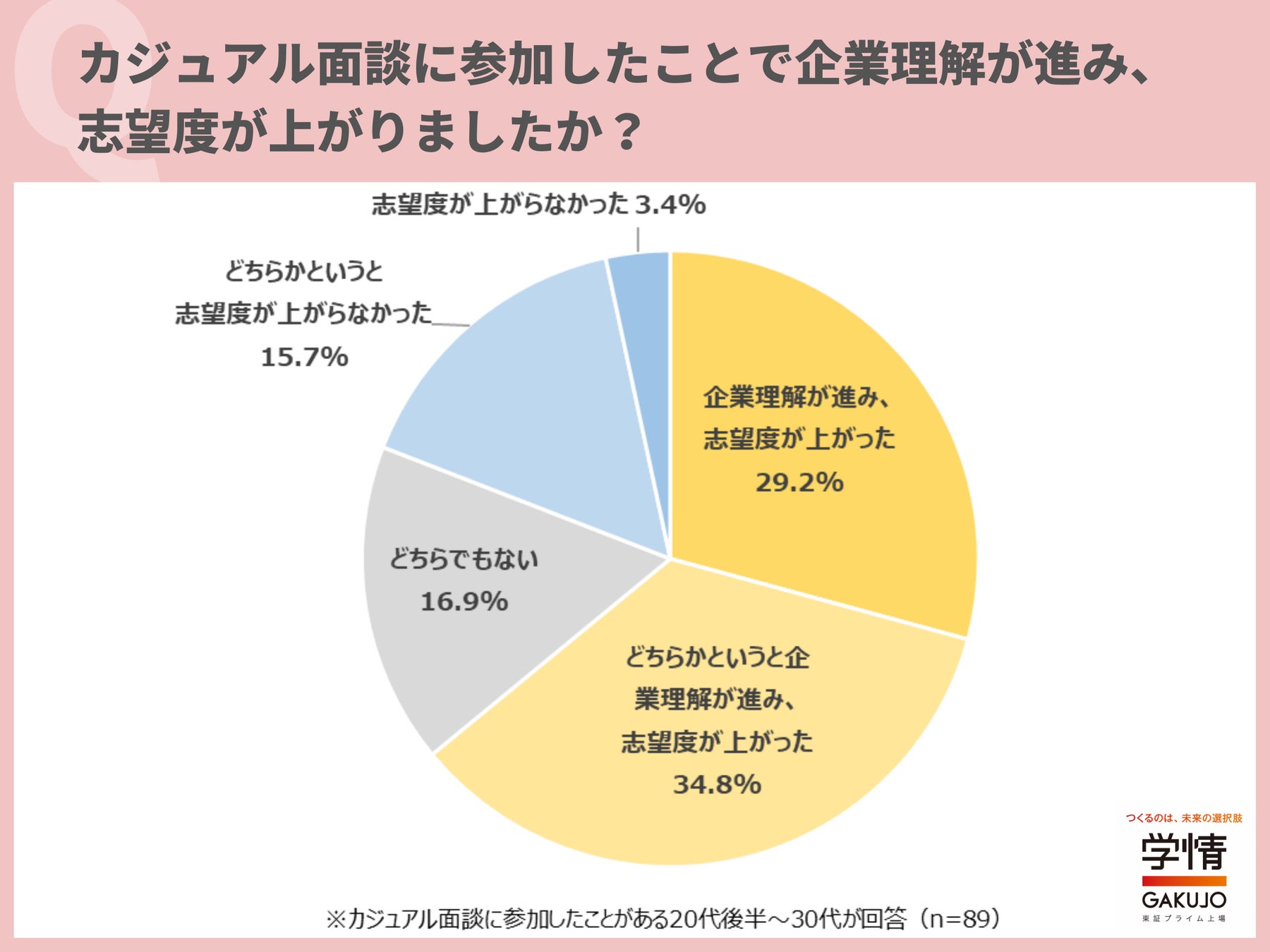 株式会社学情(本社:東京都中央区)は、20代後半~30代の仕事観や働く意識をひも解くために、アンケート調査を実施しました。今回は、「カジュアル面談」に関して調査。カジュアル面談に参加したことがある20代後半~30代のうち、6割以上が「カジュアル面談を通じて志望度が上がった」と回答しました。また、カジュアル面談で聞きたいことは、「入社した場合に自分が行う仕事内容」が最多。次いで、「働きやすさ(オフィス環境・制度・福利厚生)」、「入社した場合、自分と一緒に働く社員の人柄や雰囲気」が続きました。カジュアル面談を通じて、入社後の仕事や配属部署の雰囲気を知りたいという意向がうかがえます。