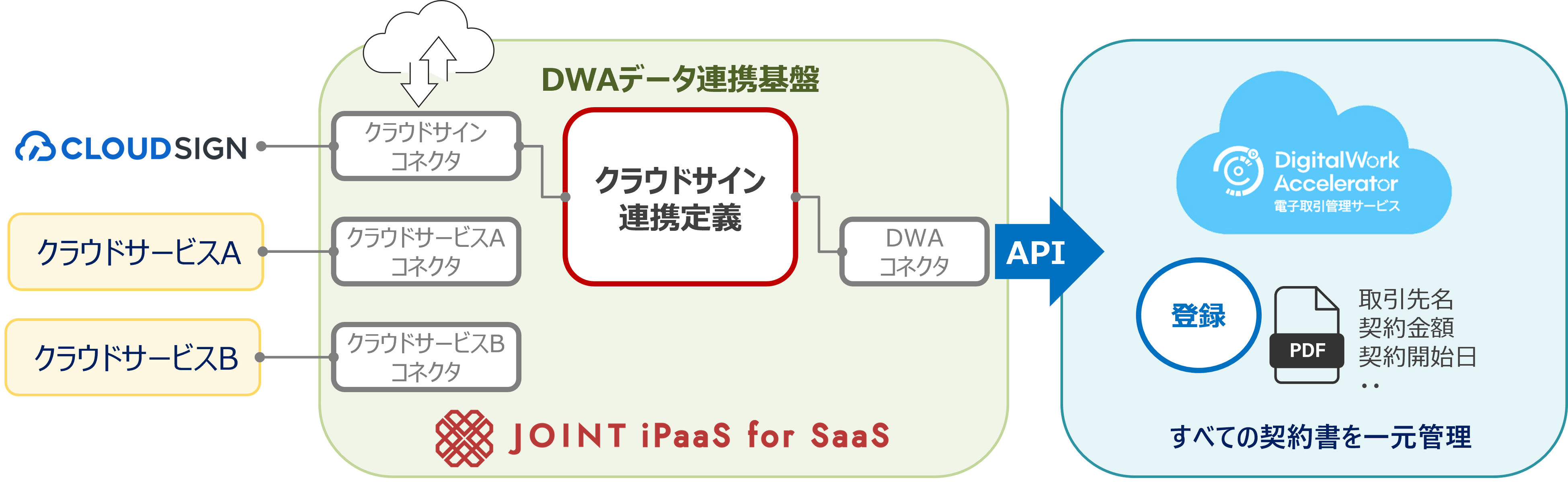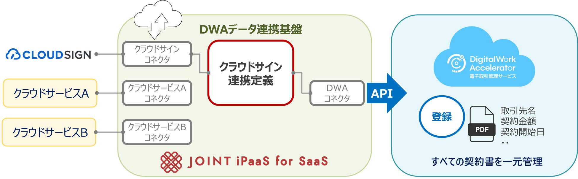 キヤノンマーケティングジャパン株式会社(代表取締役社長:足立正親、以下キヤノンMJ)は、デジタルドキュメントサービス「DigitalWork Accelerator電子取引管理サービス」において、株式会社ストラテジット(代表取締役社長:加藤史恵、以下ストラテジット)が提供するSaaSプロダクト間のAPI連携を効率的に行うSaaS連携ソリューション「JOINT iPaaS」との接続を開始します。本連携により、企業内で分散しがちなドキュメントや業務データを一元的に管理・活用できる環境を提供し、契約業務をはじめとするバックオフィス業務の効率化と品質向上を支援します。本連携の第一弾として、「DigitalWork Accelerator」と弁護士ドットコム株式会社(以下弁護士ドットコム)が提供する電子契約サービス「クラウドサイン」の連携を開始します。