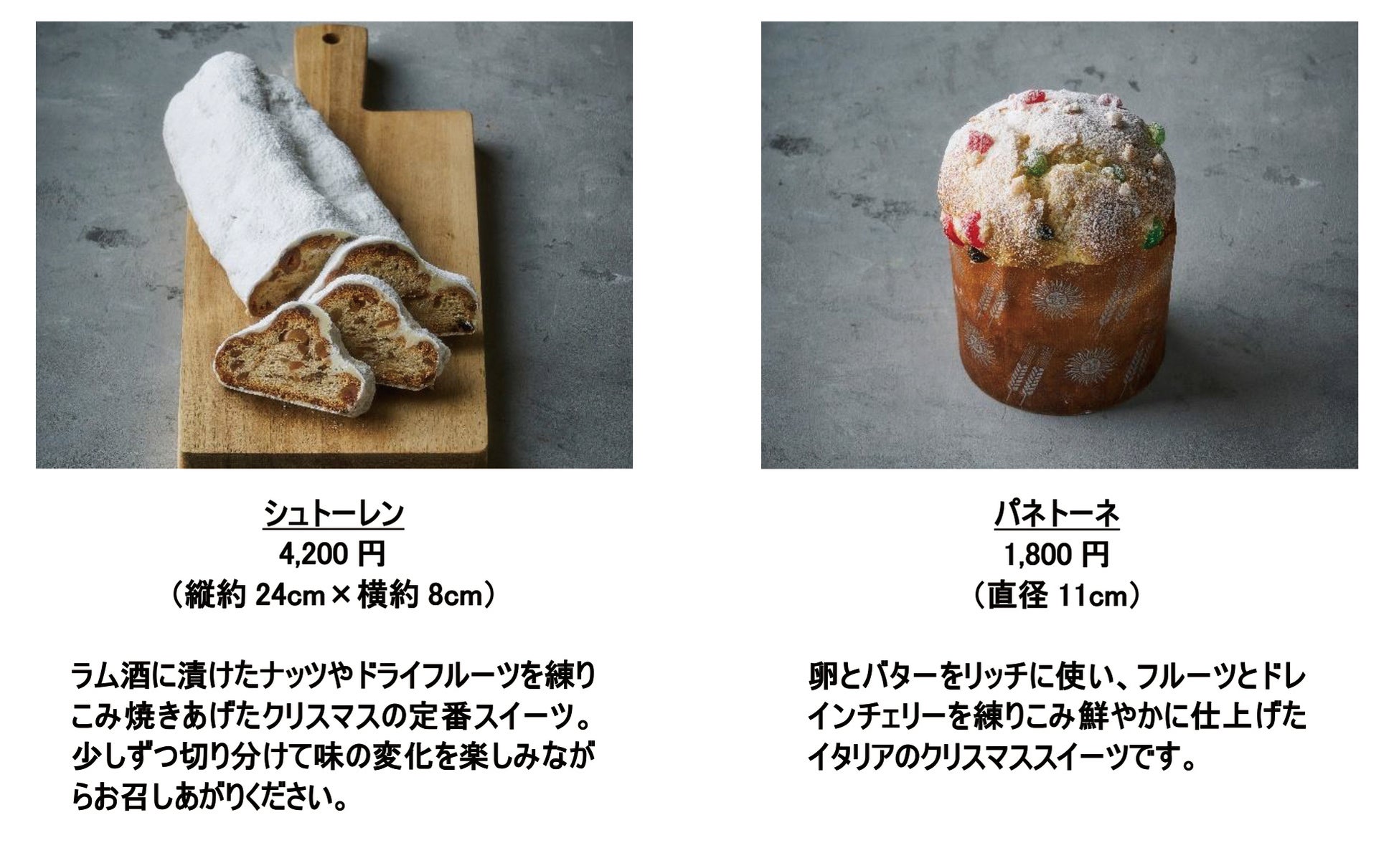 また、クリスマスの食卓を彩るメニューも充実。牛肉と香味野菜を赤ワインでじっくり煮込み、イベリコ豚のベーコンを贅沢に使ったホテルメイドの「クラシックミートパイ」や卵とバターをリッチに使った生地に、フルーツとドレインチェリーを練り込んで鮮やかに仕上げた「パネトーネ」のほか、ラム酒に漬けたナッツやドライフルーツを練り込み焼きあげたクリスマスの定番スイーツ「シュトーレン」はクリスマスに向けて少しずつ切り分け、味の変化をお楽しみください。