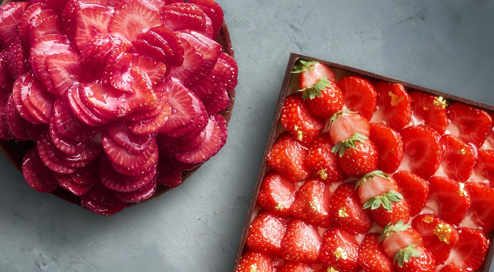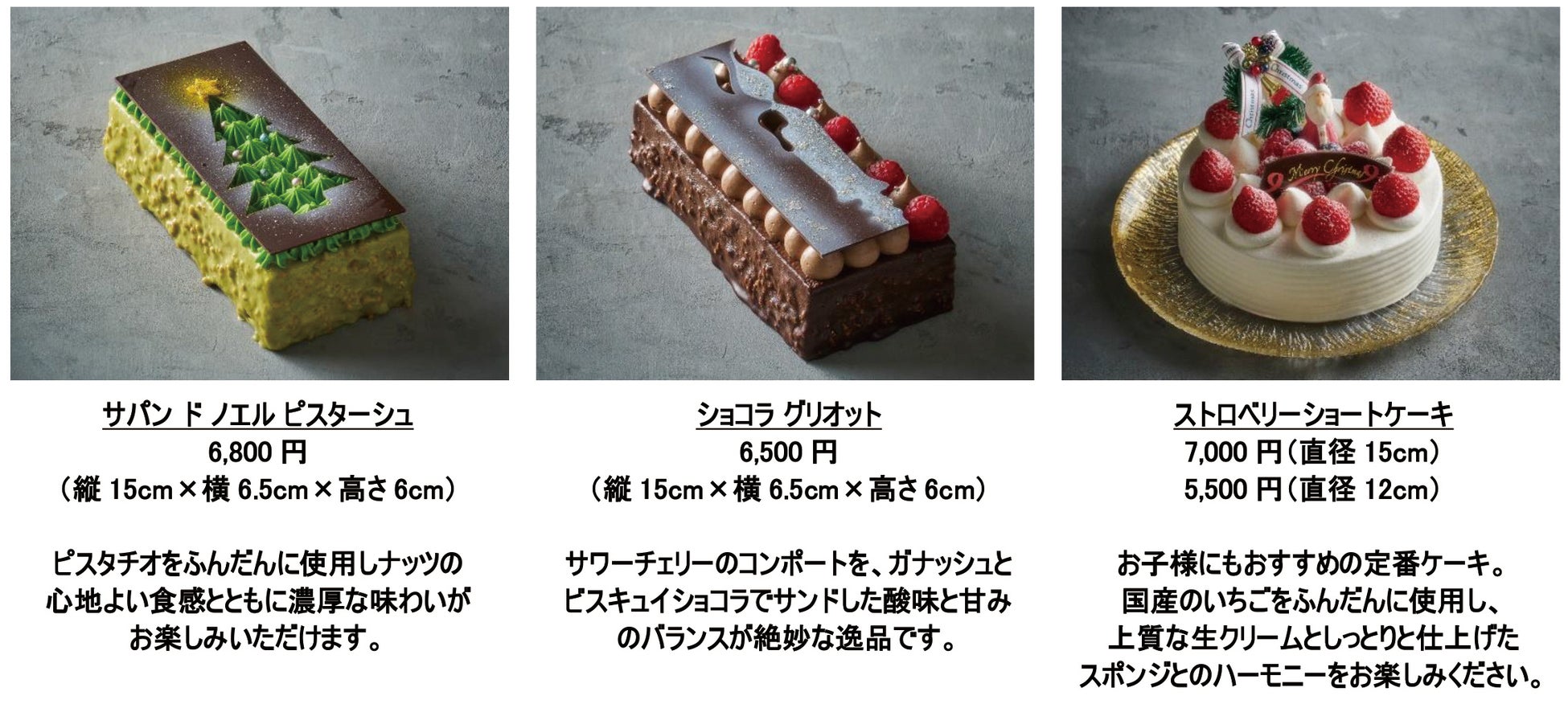 2023年のクリスマスケーキは全6種類がラインアップ。千葉県山武市の相葉苺園で栽培された、ジューシーで糖度が高く果肉までも赤い黒いちご「真紅の美鈴」を使用し「プレミアム黒いちごのタルト」は、大好評だった昨年に引き続き今年も登場。ピスタチオのタルトをベースにスポンジ生地を重ね、黒いちごを贅沢に盛り付けました。「あまおうのタルト」には、コフレ ボヌール(幸せの箱)と名付けられたチョコレートボックスに甘味と酸味のバランスがよく、丸く可愛らしい形が特長的なあまおうをまるで宝石のように散りばめました。そのほか白いちご「淡雪」を使ったショートケーキ「ブラン ド ブラン」やピスタチオをふんだんに使用しナッツの心地よい食感とともに濃厚な味わいが楽しめる「サパン ド ノエル ピスターシュ」、サワーチェリーのコンポートを、ガナッシュとビスキュイショコラでサンドした「ショコラ グリオット」、国産いちごを使用した定番のショートケーキなど、大切な方とさまざまなシーンに応じて楽しめるケーキをご用意いたしました。