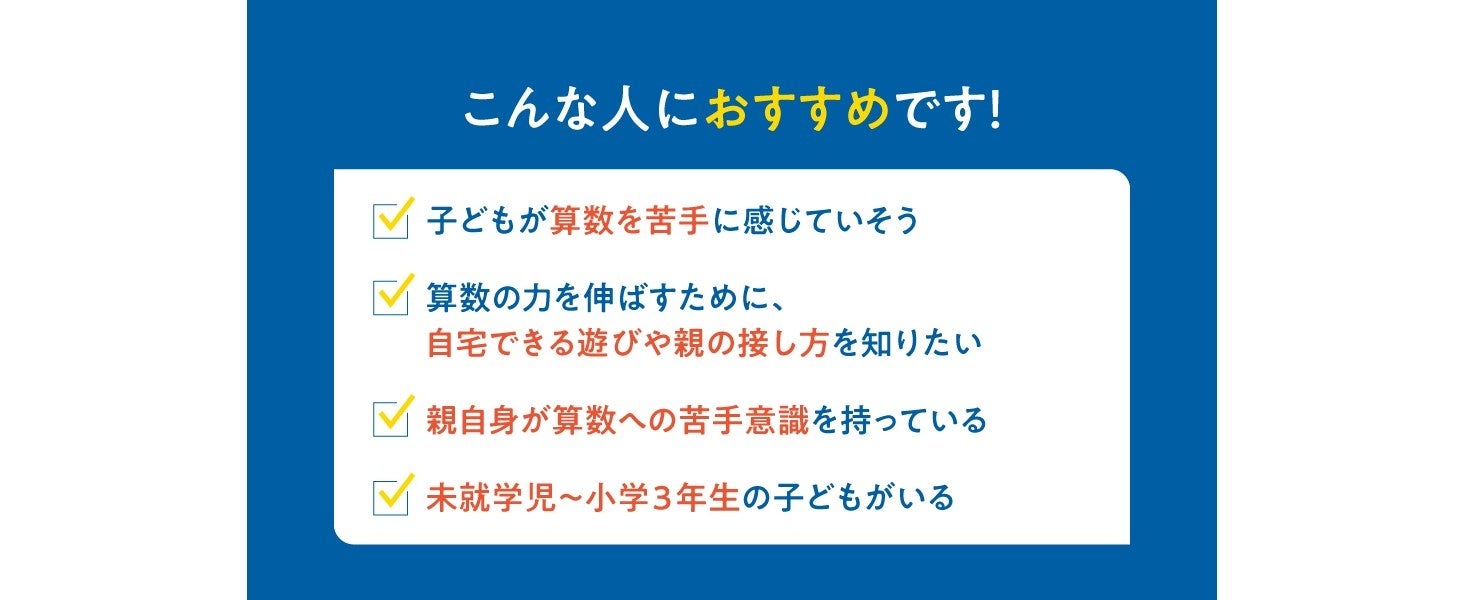 本書はおもに、未就学児~小学3年生頃までの子ども向けの内容になっています。自宅でできる算数の力を伸ばす親の接し方や遊び方がわかるので、子どもとのコミュニケーションづくりにも役立ちます。