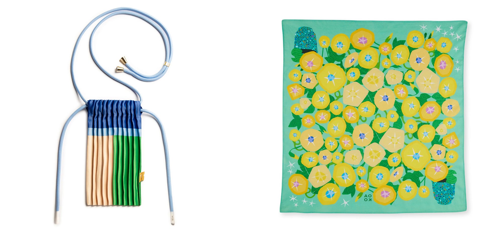 イタリア製のシルクのようなサテン生地に鮮やかなカラーブロック模様があしらわれたバッグは、巾着タイプのクロージャーで、長いコードは斜め掛けできます。ちょっとした用事や夜のお出かけにぴったりです。