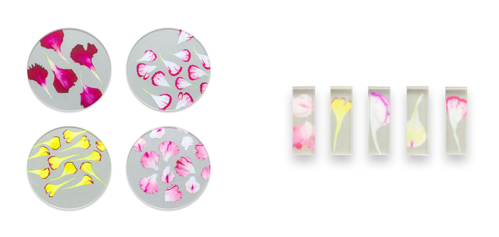 透明度の高いアクリル素材に、カーネーションの花びらが舞う。生の素材を丁寧に押花にしてから再現することで、実物がアクリルに閉じ込められているような美しさです。