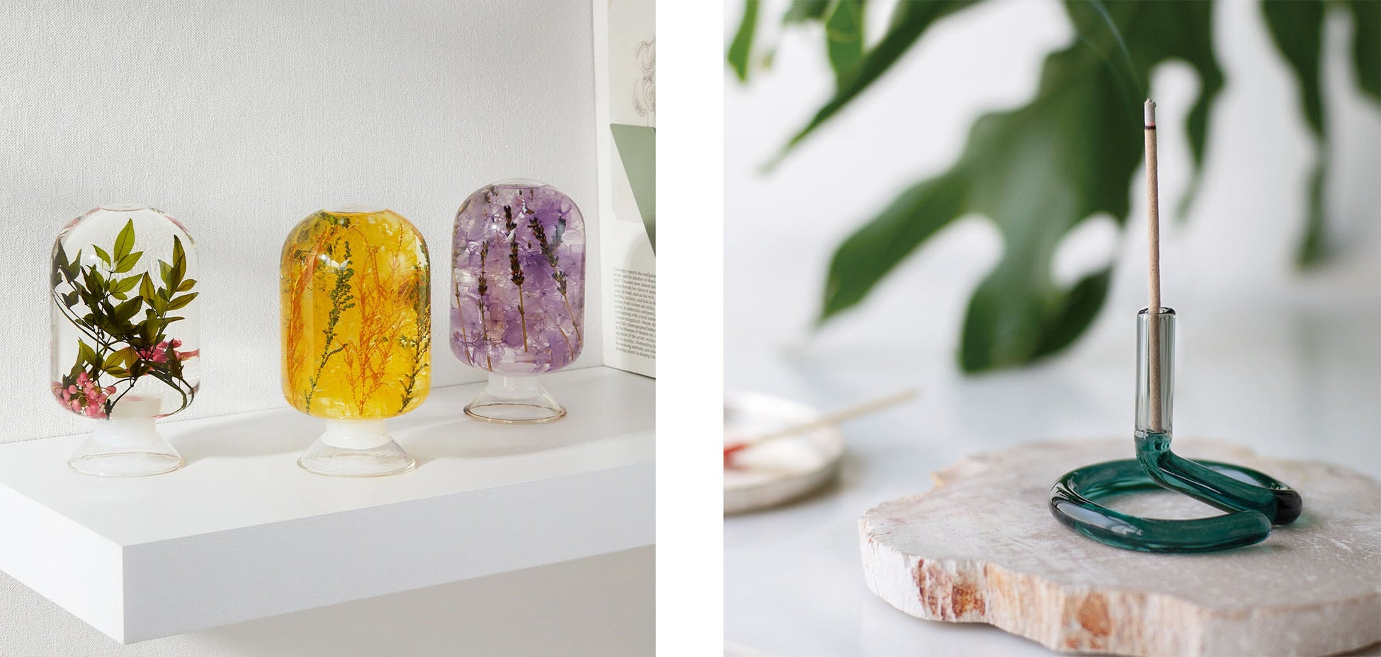 クリアなカラーグラスのコンビネーションが空間を彩る「Two Tone グラスシリーズ」 から、ユニークな形をした耐熱ガラス製のお香たてが登場。専用箱入りなので、贈り物にもおすすめです。