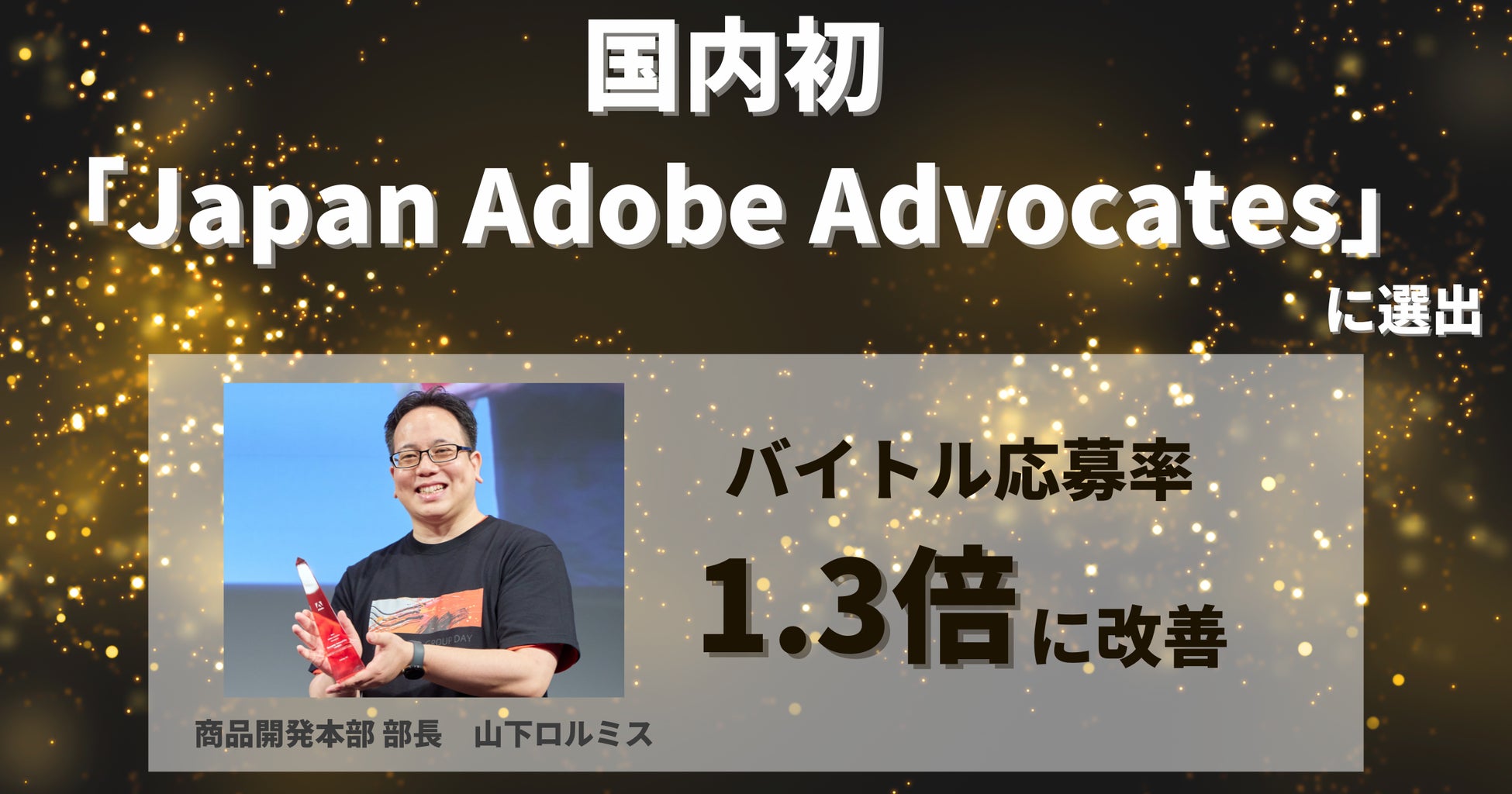 「Japan Adobe Advocates」は、アドビが年に一度ユーザーの中から、製品エキスパートとして情熱を持って高い目標に向かってチャレンジし、ユーザーコミュニティやイベント参加を通じて社内外でマーケター市場の活性化に貢献したユーザーに贈呈する称号です。