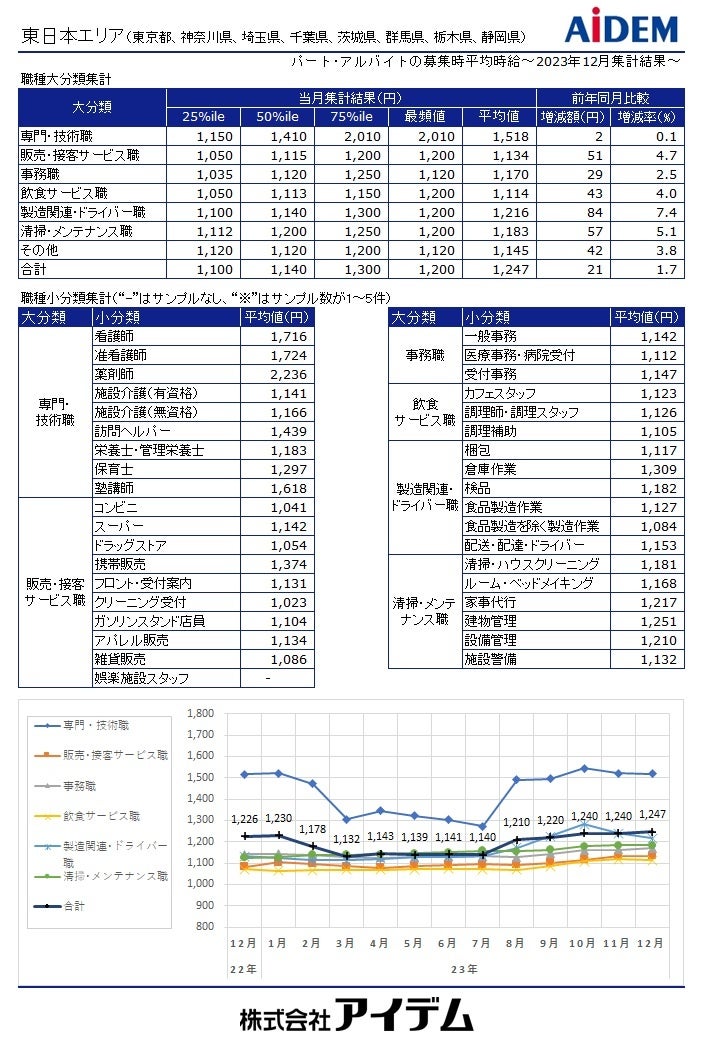 総合人材情報サービスの株式会社アイデム(本社:東京都新宿区 代表取締役社長:椛山 亮)は、求人メディア『イーアイデム』や採用ホームページ構築サービス『Jobギア採促』を利用して公表された求人情報から、2023年12月のパート・アルバイト募集時平均時給を集計いたしました。