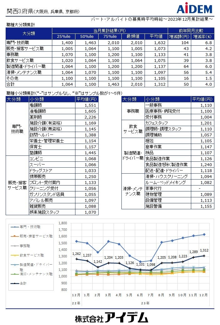 職種大分類別の平均時給は、「専門・技術職」1,632円(前年同月比104円増)、「製造関連・ドライバー職」1,137円(同64円増)、「事務職」1,133円(同41円増)、「清掃・メンテナンス職」1,097円(同56円増)、「飲食サービス職」1,075円(同39円増)、「販売・接客サービス職」1,073円(同43円増)の順で、前年同月比で全ての職種がプラスとなった。府県別の平均時給は、大阪府1,393円(前年同月比89円増)、兵庫県1,232円(同16円増)、京都府1,129円(同76円減)の順となり、前年同月比でプラスが2府県、マイナスが1県となった。
