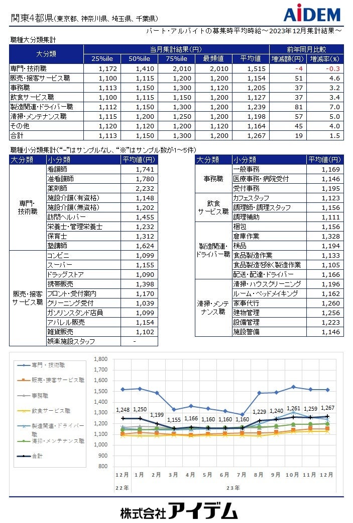 職種大分類別の平均時給は、「専門・技術職」1,515円(前年同月比4円減)、「製造関連・ドライバー職」1,239円(同81円増)、「事務職」1,205円(同37円増)、「清掃・メンテナンス職」1,198円(同57円増)、「販売・接客サービス職」1,154円(同51円増)、「飲食サービス職」1,127円(同37円増)の順で、前年同月比でプラスが5職種、マイナスが1職種となった。都県別の平均時給は、神奈川県1,311円(前年同月比31円増)、東京都1,275円(同15円増)、埼玉県1,250円(同33円増)、千葉県1,211円(同4円減)の順となり、前年同月比でプラスが3都県、マイナスが1県となった。