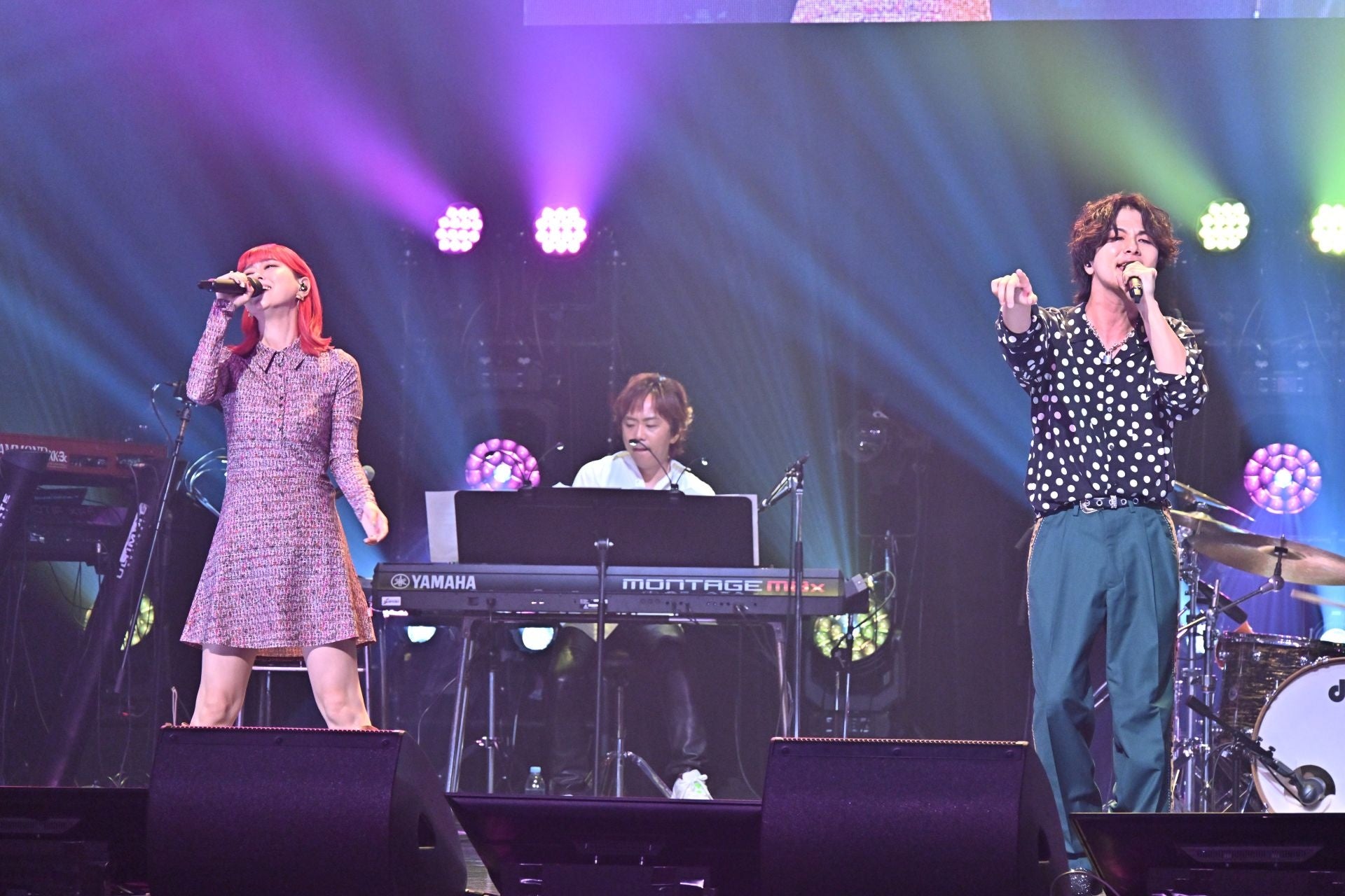 大きな拍手の中、MCの黒沢 薫(ゴスペラーズ)と中西アルノ(乃木坂46)がステージに。オープニングを飾ったのは「獣ゆく細道」だった。本曲は、黒沢がソロデビュー20周年を記念してリリースしたEP『Singaholic』に、中西をゲストボーカルに迎え、収録されている。『Spicy Sessions』が生んだコラボレーションだ。黒沢と中西が、低音域から高音域をすれ違うように行き来する。観客が2人の歌に集中していくのが分かる。最後の<狭き道をゆけ>のワンフレーズは、最後の一音のクレッシェンドのかけ方までぴったりとタイミングが合っていて、まさに2人の呼吸で聴かせる仕上がりになっていた。