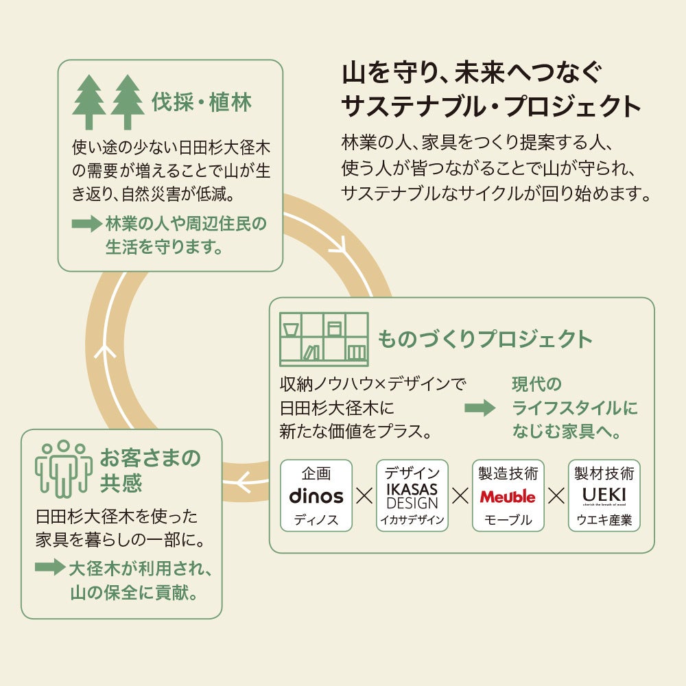 今後もディノスでは、森林循環を滞らせ、自然災害の被害を広げる一因ともなる木材を含む国産材を積極的に使用した「サステナブルなものづくり」を通じて、お客様のライフスタイルに寄り添ったアイテムをお届けするとともに、“山を守り、未来へとつなぐ”取り組みを積極的に進めていきます。
