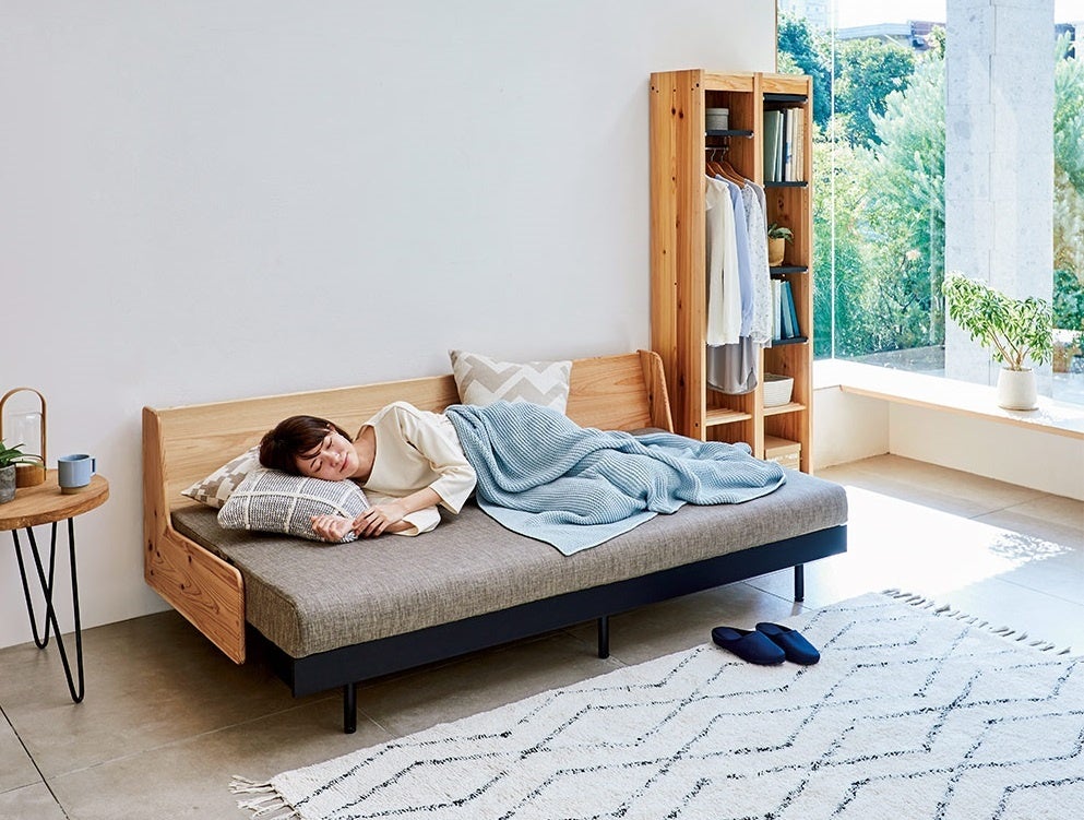 杉材のナチュラルな質感を生かしつつ、ブラックのエンボスシートやスチールを組み合わせ、現代の住空間に合わせやすいモダンなテイストに仕上げたソファベッド。壁にぴったりつけたまま座面がスライドでき、軽い力でスッと動くため、女性やお子様でもラクに引き出せます。カバーを外して丸洗いができる座面の中材には新素材「ライトウェーブ」を使用。反発性・耐久性・通気性・速乾性に優れ、快適な座り心地、寝心地を叶えます。
