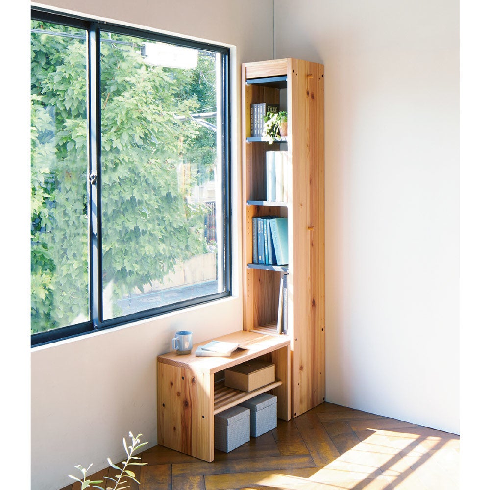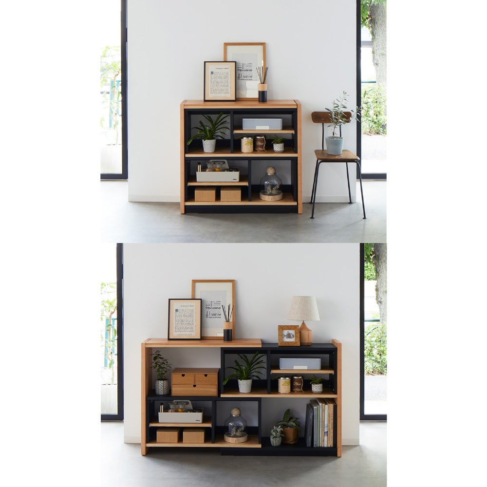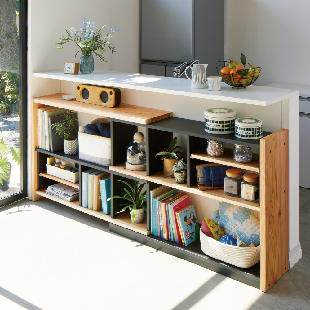 仕切りや棚板の構成をランダムにし、デザインにリズム感を加えた、ブラックの化粧板と杉のバイカラーがモダンな印象の伸縮ラック。スペースや目的に合わせて無段階伸縮が可能で、L 字に設置することもできるのでコーナーのデッドスペースも有効活用できます。背板がないので、コンセント前にも置くことができ、A4 サイズの書類も入るため、ワークスペースにオススメです。