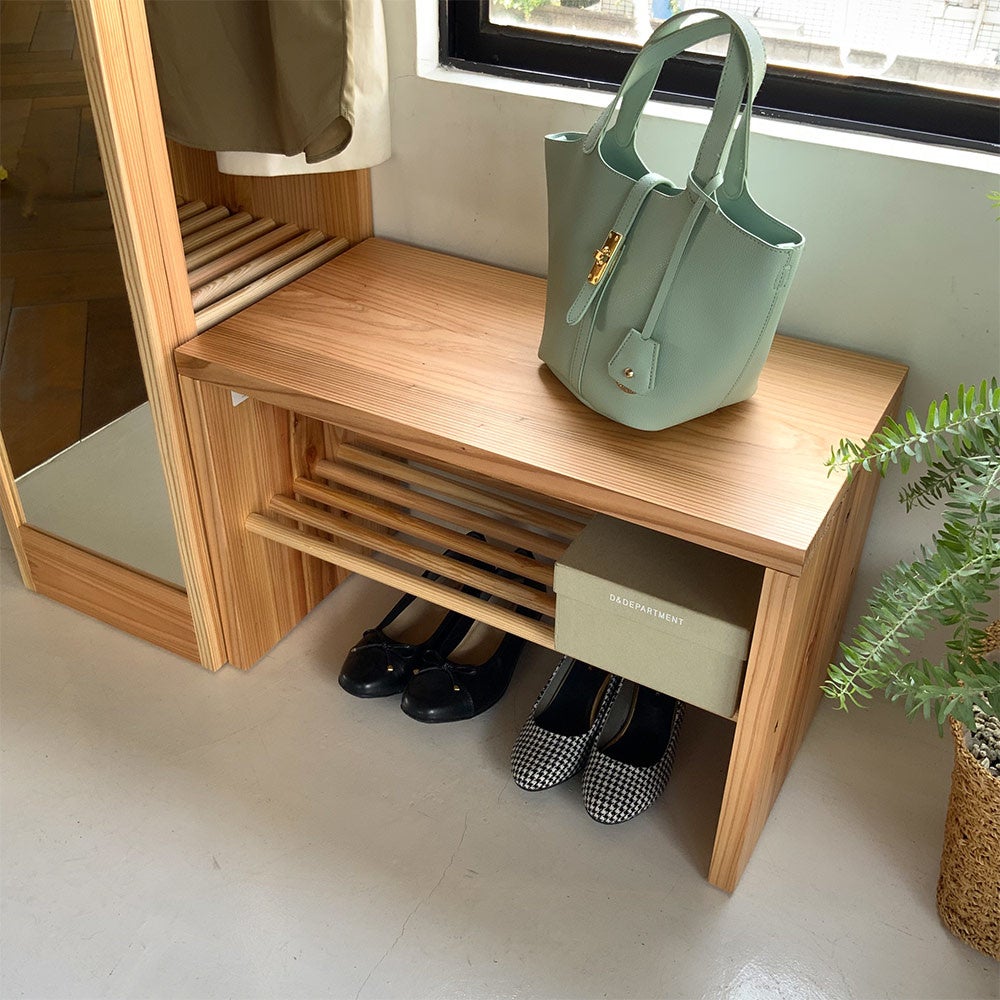杉の温かな手触りや香りが特長のシェルフとベンチです。姿見として活躍する大型ミラー付きのシェルフは、収納物に合わせて高さを変えられる可動棚板と、使わない時は最上段に上下逆に設置すればバーを隠すことができるハンガーバー付き可動棚板付属で、見た目もすっきり。さらに、シェルフと靴の脱ぎ履きに便利なベンチを組み合わせれば、まるで造り付け家具のようにセッティングでき、統一感のある空間に仕上げることができます。