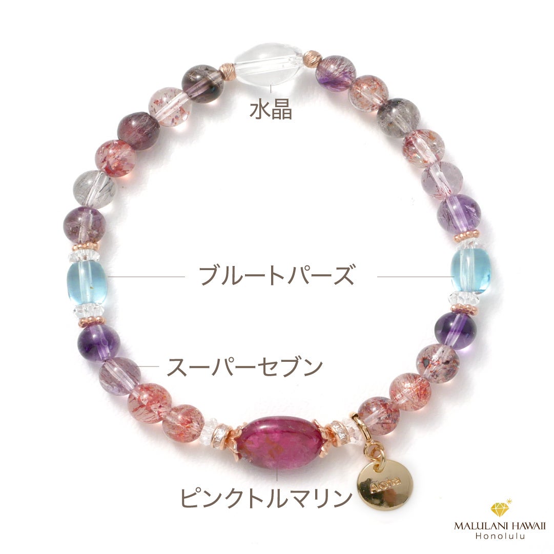 7種の鉱物を内包する奇跡の石スーパーセブンと、愛を引き寄せるピンクトルマリン、澄んだエネルギーを放つブルートパーズで仕立てた、美しいブレスレット。