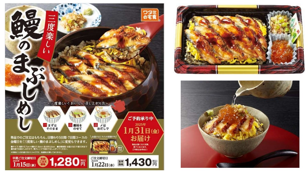 「ワタミの宅食」では季節や行事を感じていただけるよう、数量限定で特別弁当の販売を行っており、2024年度は月替わりでの販売を行っております。今回販売します「三度楽しい 鰻のまぶしめし」は、2025年1月31日(金)にお届けをします。