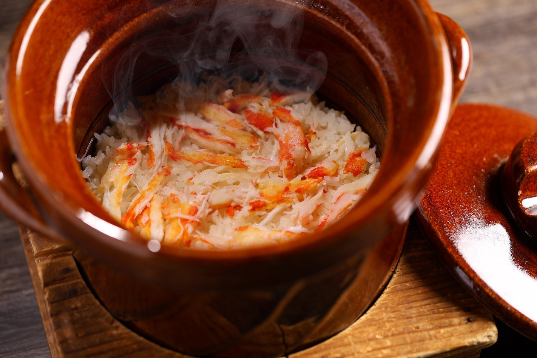 「蟹の釜めし」は、甘みと旨味が詰まったプリプリした蟹とふっくら炊き上げたご飯が相性抜群です。