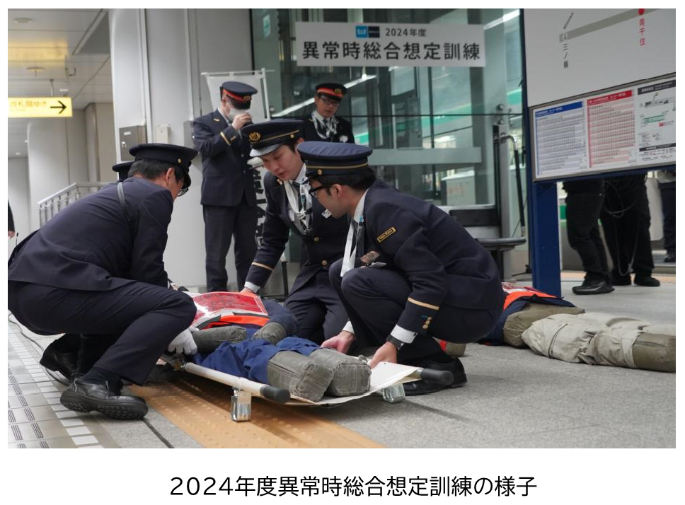 駅社員・乗務員によるお客様の避難誘導、消防隊と連携した負傷者の応急救護・搬送を行い、