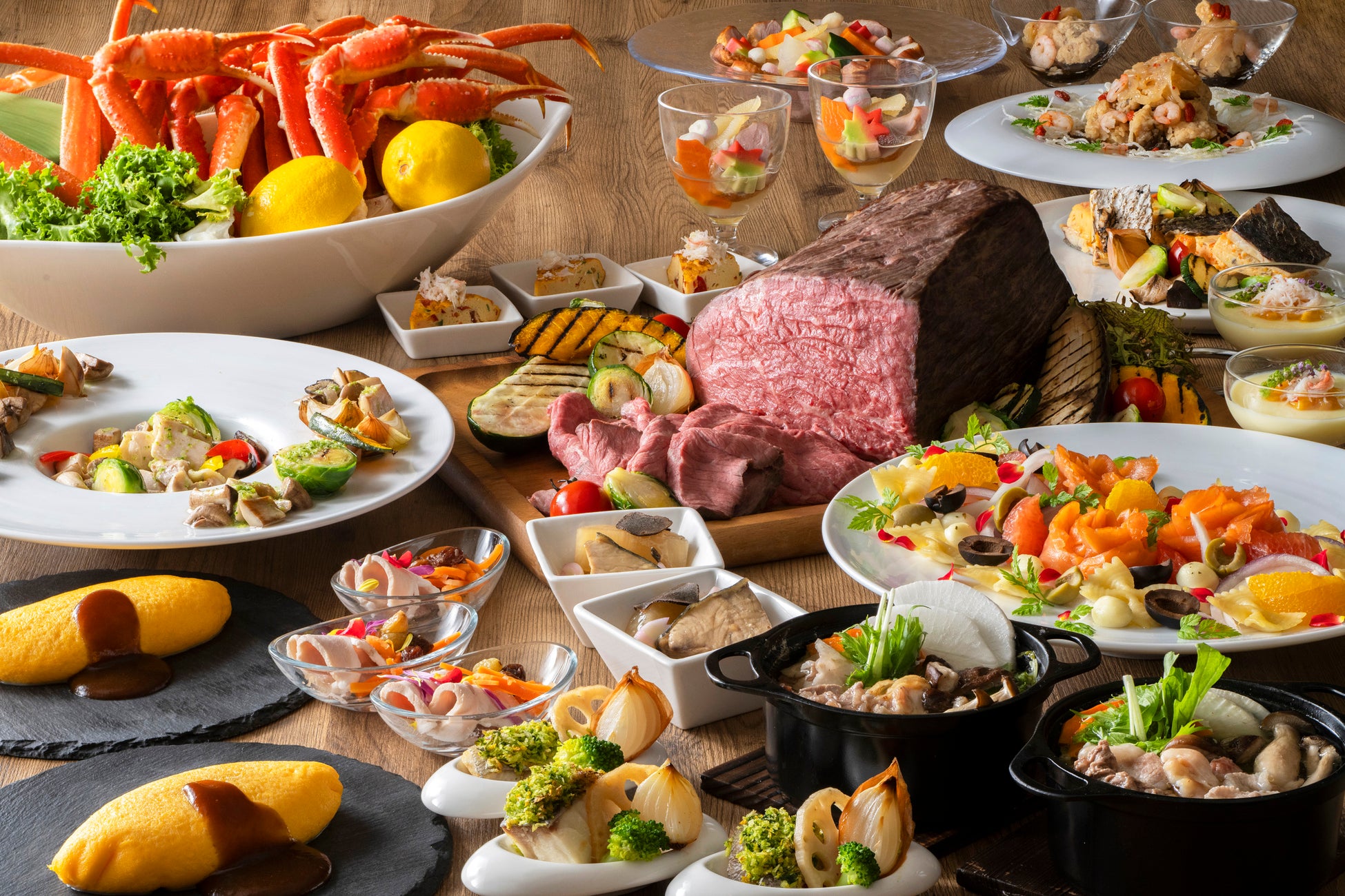 好評の「ズワイ蟹」とともに、シェフが目の前でカットサービスする「ローストビーフ」や、寒い季節には心も体もあたたまる牛・豚・鶏肉を使った「ミート鍋」などバラエティー豊かなメニューをご用意します。
