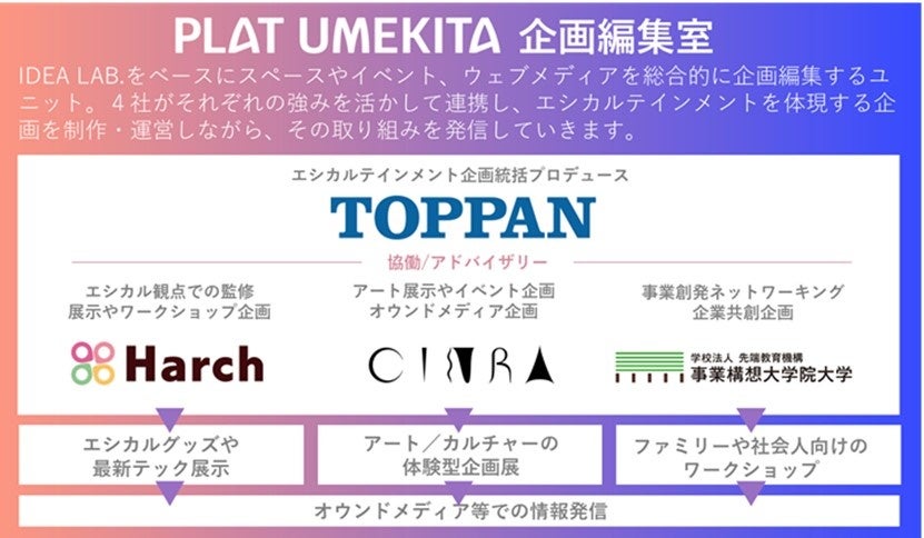 TOPPANを中心にCINRA、ハーチ、事業構想大学院大学の4者で「PLAT UMEKITA企画編集室」を組成。IDEA LAB.をベースにこのスペースのコンセプトを体現する展示/イベントを様々なクリエイターと共創します。また、定期的なワークショップも開催し、都市公園の新しい楽しみ方をつくりだすコミュニティの創出を目指します。最新のエシカル情報を発信し、リアルスペースでの企画に連動した各種メディアも制作する予定です。