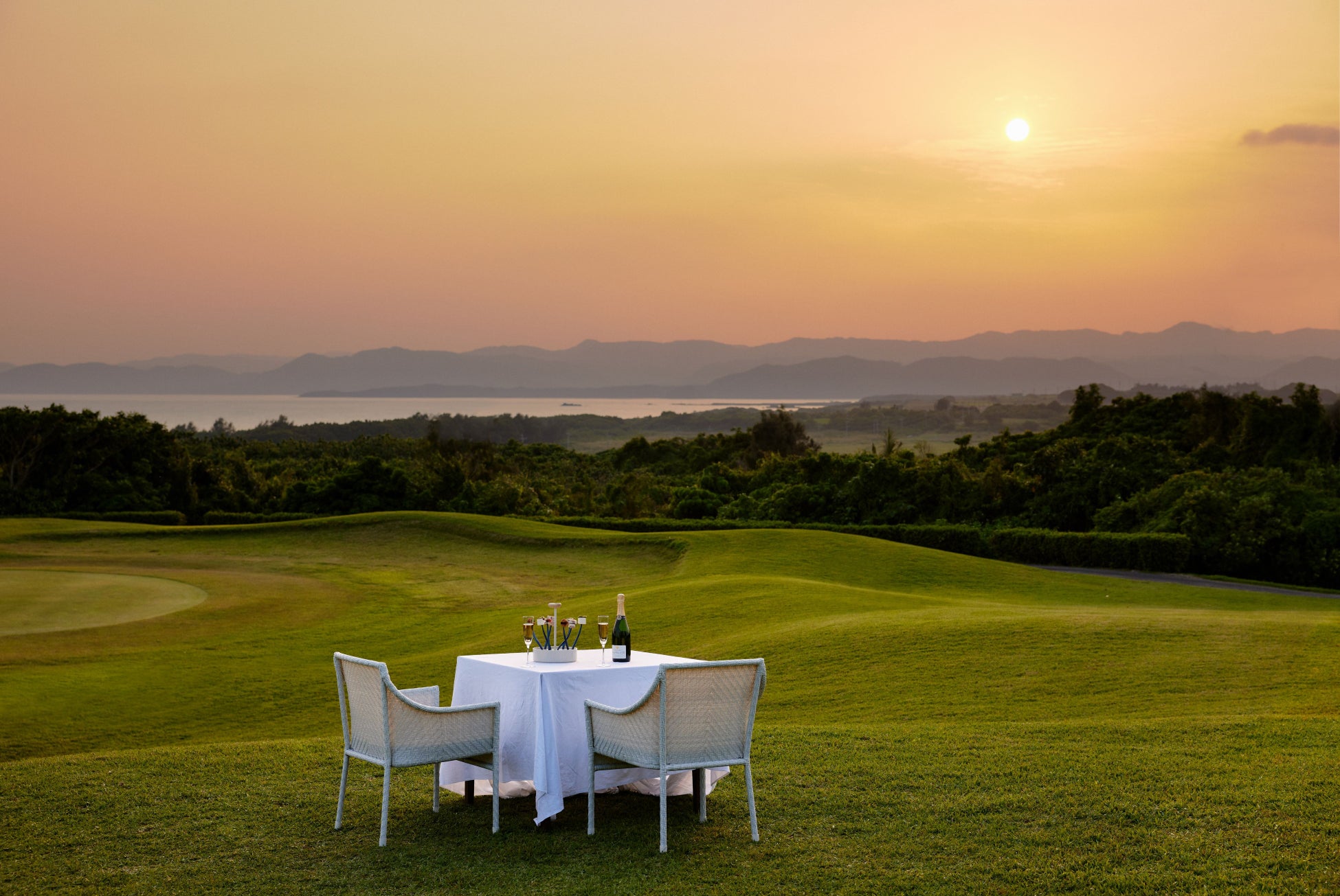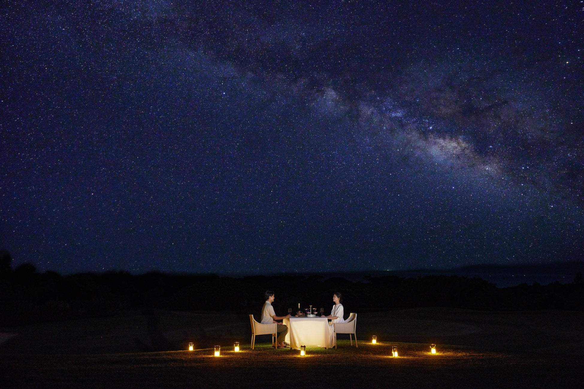 高台に位置する「小浜島カントリークラブ」は、西表島に沈みゆく夕日を一望することができ、国内で初めてダークスカイ・インターナショナル(*1)による「星空保護区®」(*2)の認定を受けた西表石垣国立公園内に位置しています。夕暮れから星空へとうつろいゆく絶景を堪能してほしいという想いから、本プランの開催に至りました。