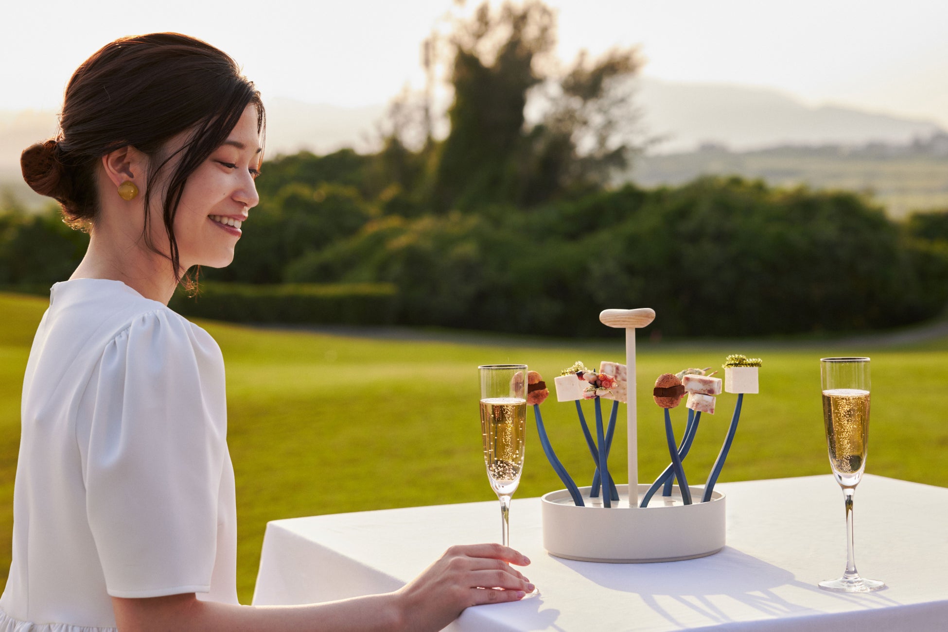 夕日が差し込む特等席で、あぐー豚の生ハムや、サーターアンダギーなど、沖縄食材を使用したフィンガーフードを食前酒とともにゆっくりと堪能します。目の前に広がるのは、西表島に沈みゆく夕日が織りなす茜色の絶景。心地よい秋風にあたりながら、特別なアペロタイムを満喫することができます。