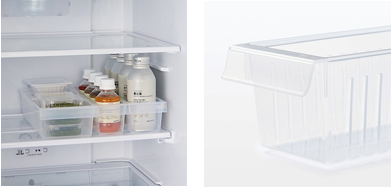冷蔵庫内の整理・収納に便利なトレ―は、並べても無駄なスペースができにくく、引き出しやすい持ち手付きのため、庫内の奥まで有効に使えます。3サイズあり、小はミニドリンクや調味料、中は缶飲料、大は納豆や豆腐などのパック類の収納におすすめです。保冷効率の良さも考えてスリットを入れています。