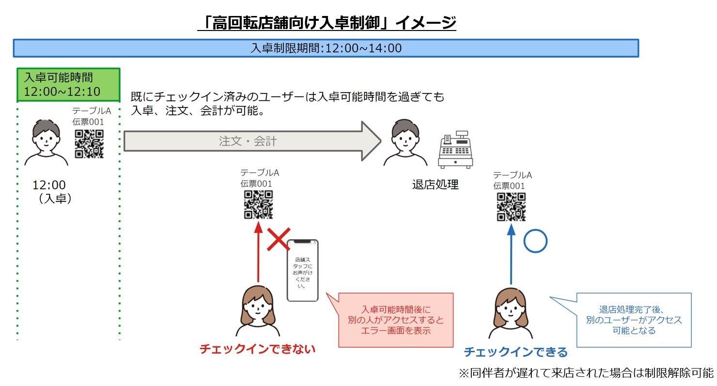 本機能は、カフェやカレー、ラーメン業態など席の回転率が高い飲食店を主なターゲットとし、同一QRコードでの入卓可能時間を制限することで、前後のお客様の注文内容の混在を防ぐ機能になります。従来のモバイルオーダーは、利用者がテーブル上にある共通のQRコードを利用するため、席の回転率が高いお店では、前に利用したお客様の会計前に同じ席へ次のお客様を案内すると、前のお客様の伝票に後のお客様の注文内容が混在してしまう課題がありました。本機能によりこのような課題を解決し、お客様を連続してテーブルにご案内できるようになります。