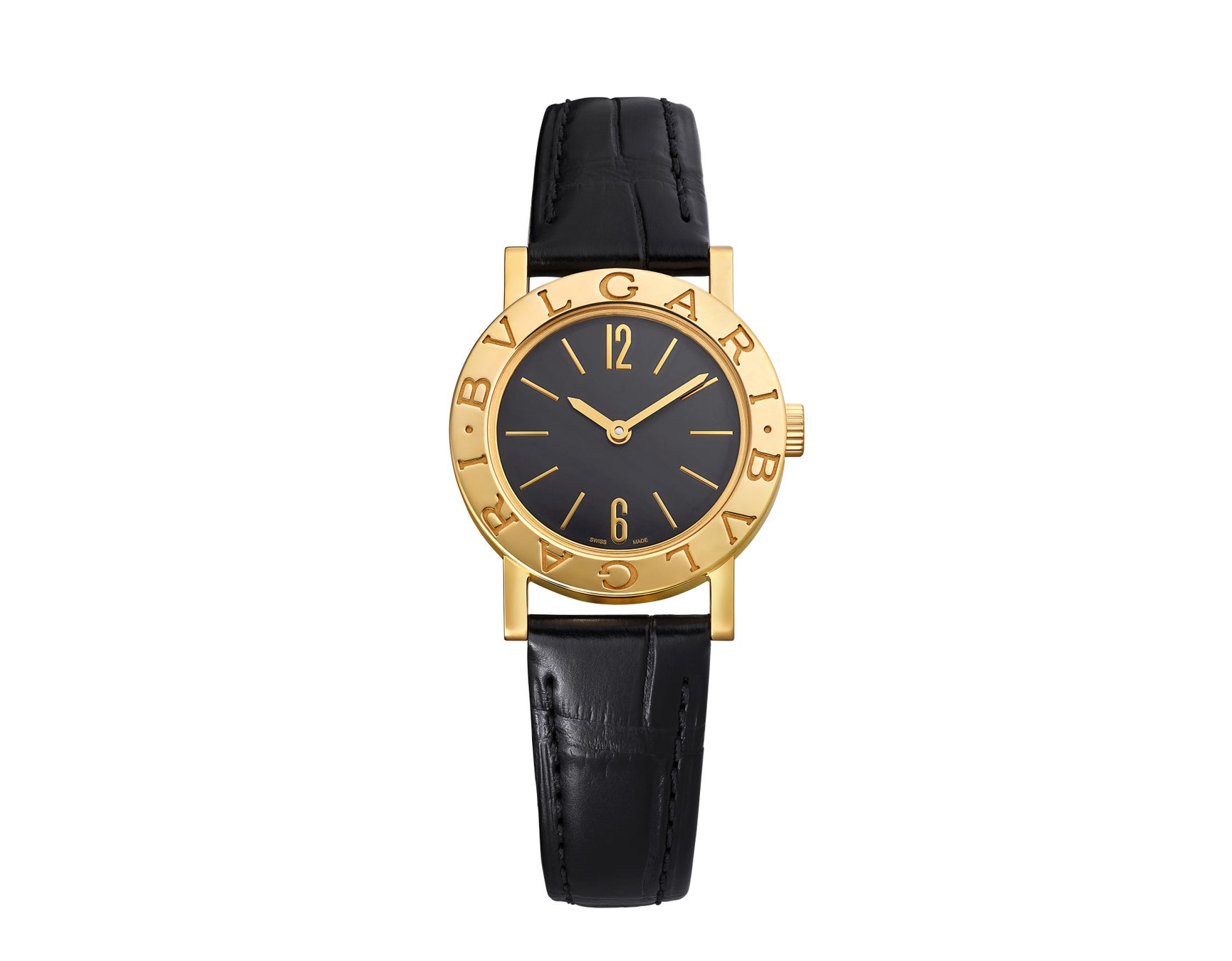 1975年発表の初代モデルを踏襲したイエローゴールドの新作は、ブラックのダイヤル上に配されたゴールドコーティングの12時と6時位置のアラビア数字と細長いバトンインデックスのコントラストが印象的なタイムピースです。ミニマリズムに徹したダイヤルがベゼルに刻印された文字の存在をさらに際立たせています。オリジナルの「ブルガリ・ブルガリ」のデザインを受け継ぎながら、幾何学的なラグがケースからブラックアリゲーターストラップへと繋がっていきます。ピンクゴールド製ケースのバージョンは、ダイヤルにシルバーオパーリンを採用しよりやわらかな雰囲気を感じさせるピースとなっています。