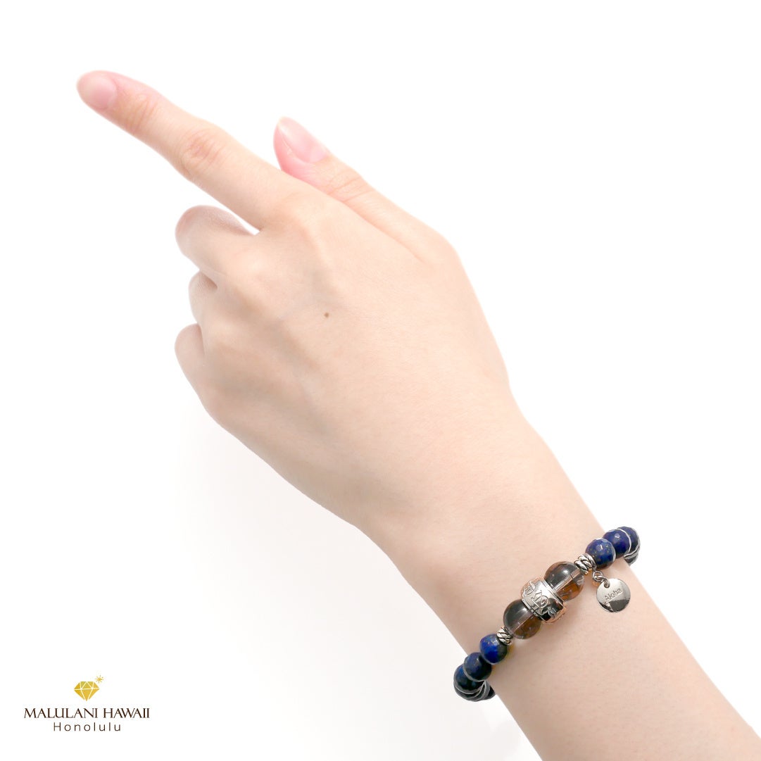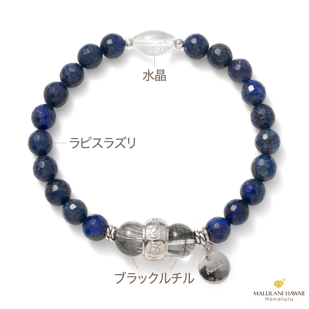 財運やチャンスを運ぶブラックルチル、最強の幸運をもたらすと伝えられるラピスラズリに、「神に護られた」という意味のハワイ語「Malulani」と刻印のオリジナルハワイアンジュエリーで仕立てたブレスレットは、ご自身のお守りや大切な方へのプレゼントにもおすすめ。