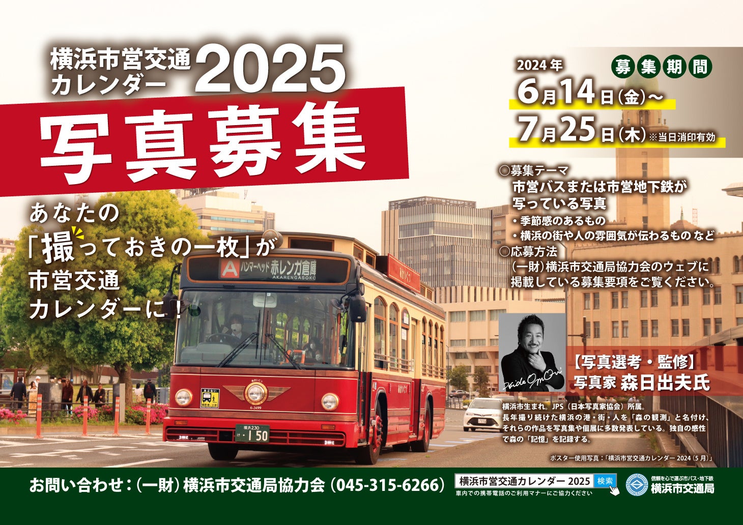 毎年ご好評いただいている「横浜市営交通カレンダー」は、2025年版も写真家 森 日出夫氏による選考・監修のもと、皆様から市営バス・市営地下鉄の写真を募集して制作します。