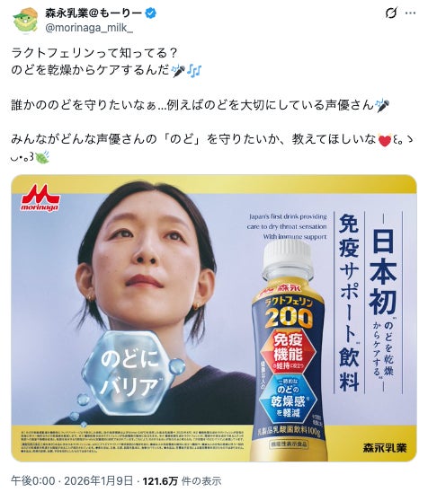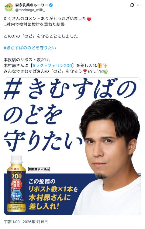 森永乳業は、X(旧Twitter)上でのファンの応援が“そのまま差し入れ”として本人に届く参加型キャンペーン「#きむすばののどを守りたい」を、2026年1月19日(月)より開始いたします。