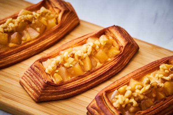 甘味と酸味のバランスがとれた長野県産りんごと洋梨、くるみを乗せ焼き上げました。シナモンの風味、サクサクのデニッシュ生地、香り高いフルーツが相性抜群です。