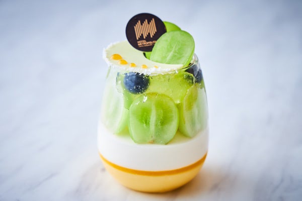 白ワインのサバイヨンムース、アプリコットクーリ、ヨーグルトのババロアを重ね、パリッとした食感でジューシーなシャインマスカットを味わえる季節のヴェリーヌです。