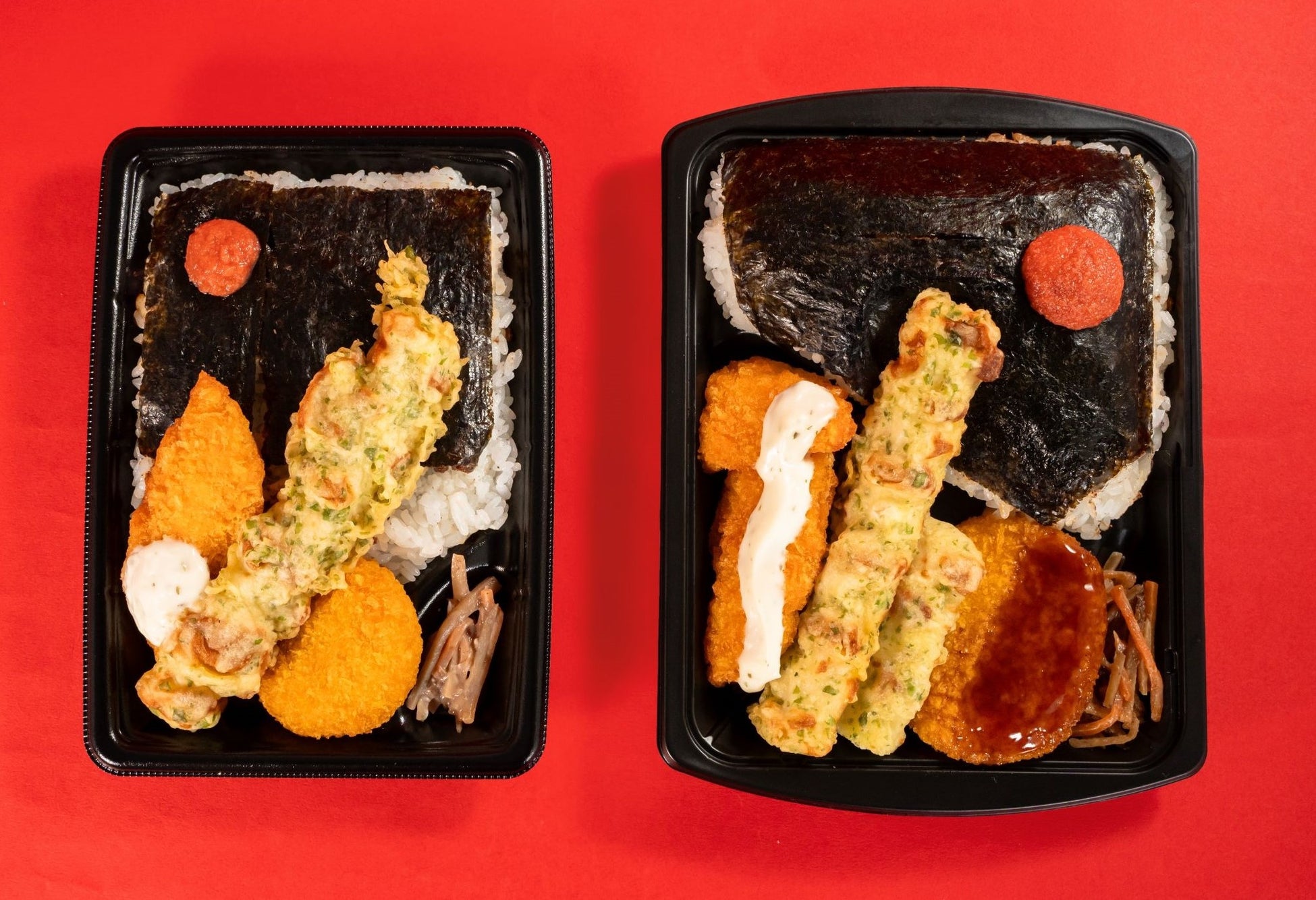 【内容】明太子、白身魚フライ、ちくわ磯辺天、コロッケなどを盛り合わせた海苔弁です。すべての具材とご飯が、それぞれ「たぶん40%増量」しています。