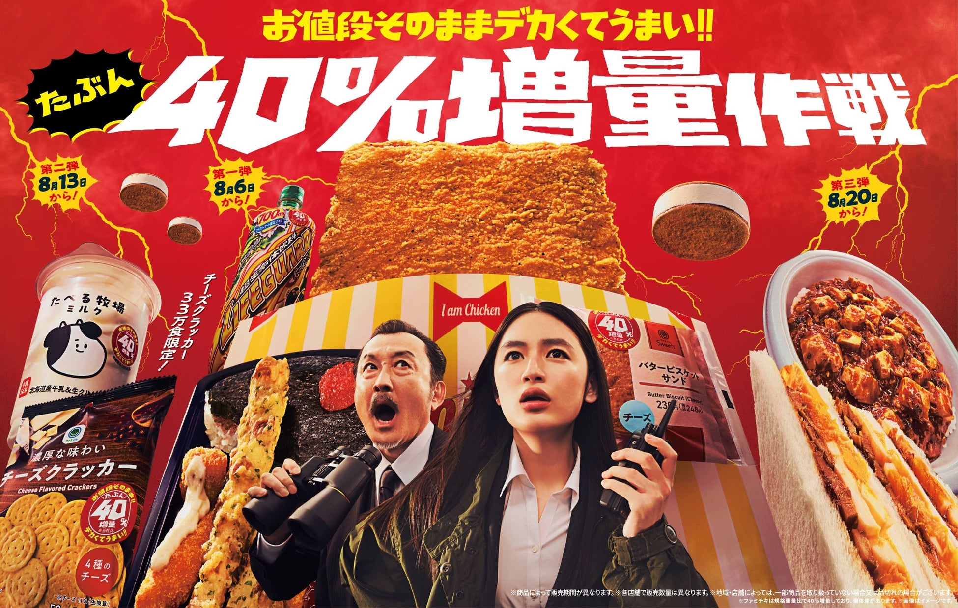 第4弾となる本年は、「お値段そのままデカくてうまい!!たぶん40%増量作戦」と新キャンペーン名で開催します。人気のファミチキや弁当、サンドイッチ、菓子、飲料に加えて、デザート、アイスなど、全12種類の商品が週替わりで登場いたします。
