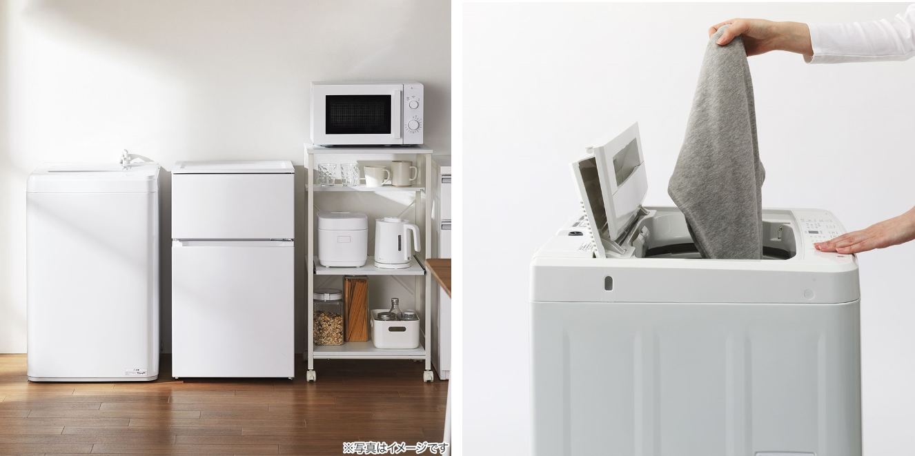二つ折り蓋仕様のため、洗濯機上部のスペースも有効に活用できます。洗濯コースは5種類から選択可能。冷蔵庫と同様、ホワイト・ブラックの2色展開です。