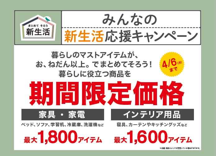 「暮らしのマストアイテムが、お、ねだん以上。でまとめてそろう。」をテーマに、ベッド・ソファ・洗濯機・冷蔵庫などの家具・家電は最大1,800アイテム、寝具・カーテン・キッチングッズなどのインテリア用品は最大1,600アイテムを期間限定価格でご提供いたします。