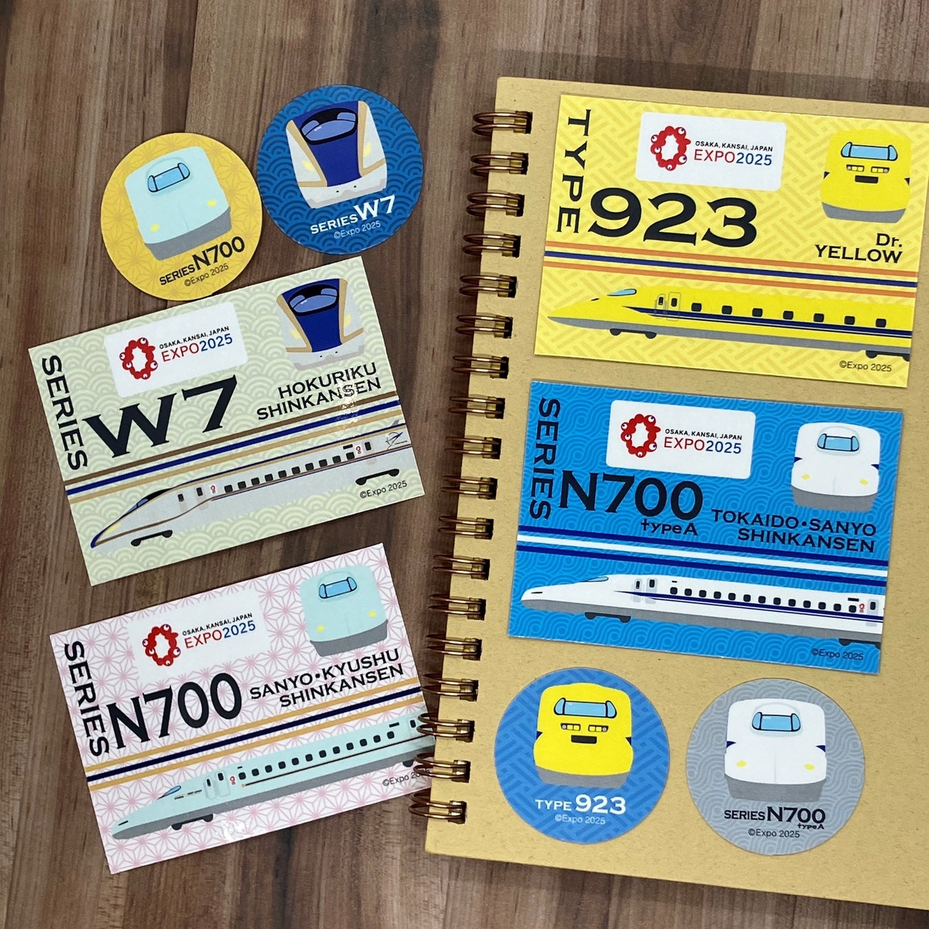 大阪・関西万博ラッピング新幹線と大人気のドクターイエローは、各車両を大きくデザインしたインパクト抜群の大判四角型サイズと、使いやすい丸型コンパクトサイズの2枚セット。