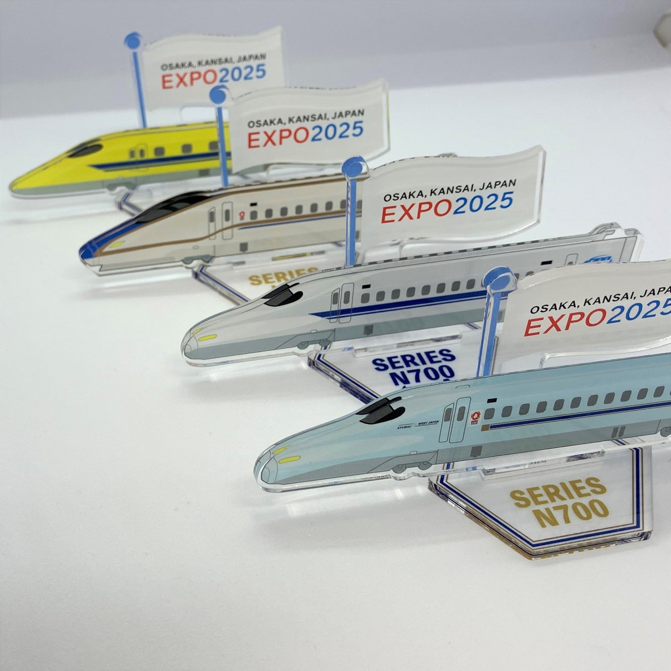 大阪・関西万博ラッピング新幹線と大人気ドクターイエローのアクリルスタンドは、クールなデザインで、並べてみると圧巻!