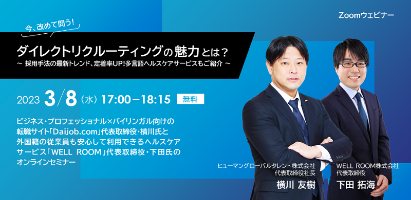 ビジネス・プロフェッショナル×バイリンガルのための転職・求人情報サイト「Daijob.com」を展開するヒューマングローバルタレント株式会社(本社:東京都新宿区、代表取締役:横川 友樹、以下「当社」)は、2023年3月8日(水)に無料ウェビナー「今、改めて問う!ダイレクトリクルーティングの魅力とは? ~採用手法の最新トレンド、定着率UP!多言語ヘルスケアサービスもご紹介~」をWELL ROOM株式会社(本社:東京都千代田区)と共同で開催いたします。ウェビナーには当社代表取締役・横川友樹とWELL ROOM株式会社の代表取締役・下田拓海氏が登壇いたします。