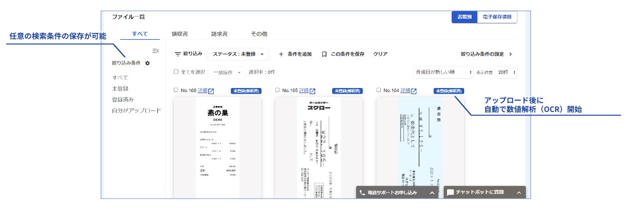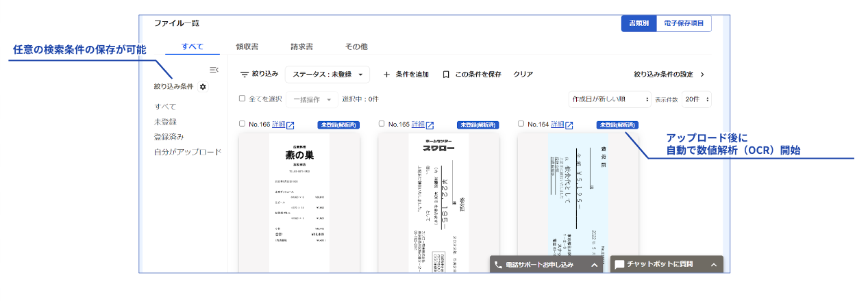 アップロードした証憑はインボイス情報・取引日・金額等で絞り込んで検索することが可能です。よく確認する証憑をワンクリックで条件ごとに一覧で閲覧可能です。