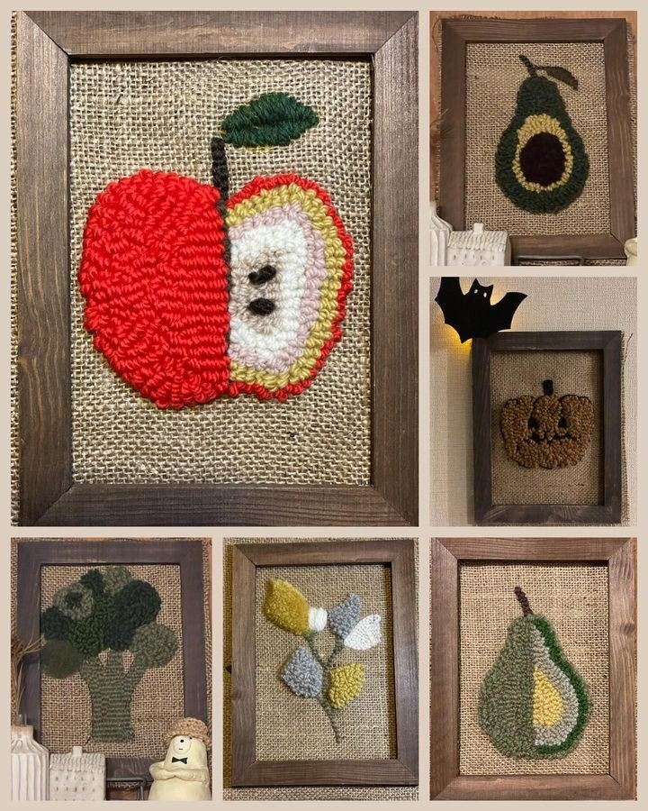 オックスフォードパンチニードルを使ってフレームを制作します。サンプルの図案の中から1つ選んでいただき、約20色の毛糸の中からお好きな色の毛糸を選んで刺していただきます。サンプルは様々な刺し方が体験できるようなデザイン。サンプル通りはもちろん、刺し方を少し変えていただくことも可能です。フレームの裏にフェルトを貼って、そのままお持ち帰りいただけます。