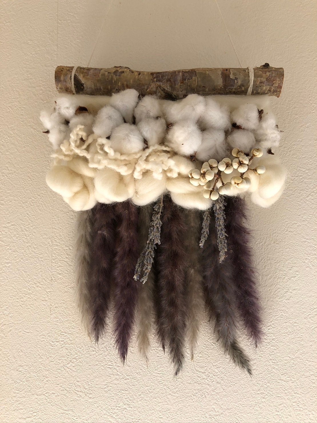 寒くなるこれからの季節にぴったりな、ふわふわもこもこの壁飾りを作ります。植物と原毛などを合わせて、ウィービングタペストリー風に仕立てます。お部屋で眺めていただきたい、おすすめの壁飾りです。