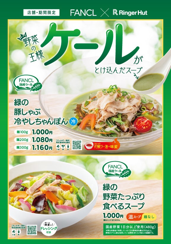 ファンケル ケール青汁を使用した「緑の豚しゃぶ冷やしちゃんぽん」「緑の野菜たっぷり食べるスープ」が6月16日(月)から販売開始