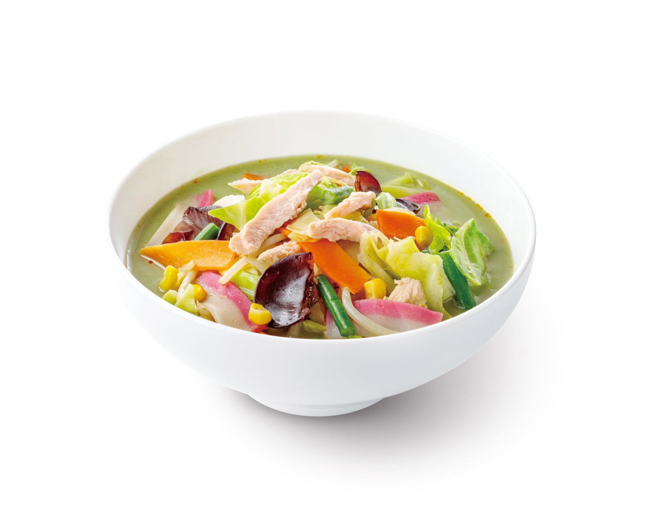 通常の「野菜たっぷり食べるスープ」同様、7種類 計480gの国産野菜を使用しており、ボリューム感もありながら、434kcalというヘルシーなメニューです。さらに今回はファンケルの国産ケール青汁が入っているので、より栄養がとれる商品となっており、糖質を控えたい方、健康意識の高い方にもお勧めの商品です。